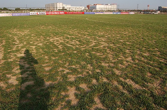 毫不夸張地說(shuō),場(chǎng)地內(nèi)草地的覆蓋面積幾乎比露土的面積還要少,而且場(chǎng)地嚴(yán)重不平。這樣的場(chǎng)地,皮球是很難控制的,而且也很容易造成隊(duì)員受傷。