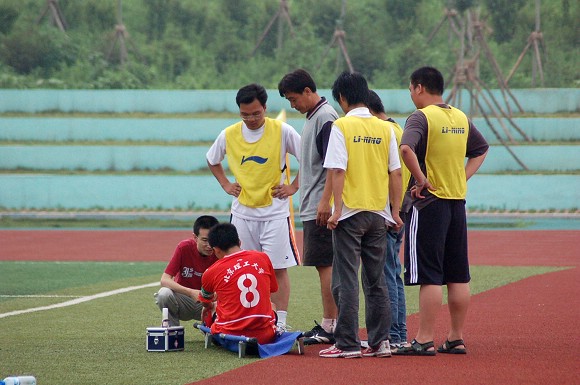 場上隊長8號袁微被對方鏟傷后,在場邊接受臨時治療。