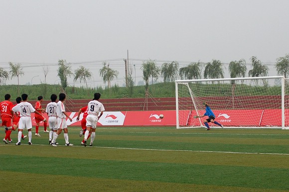 緊張的比賽一直進行到下半場第40分鐘,我方場上隊長8號袁微帶球由底線附近突入禁區(qū),在過人時被對方隊員惡意絆倒,我方獲得一個珍貴的點球,由6號隊員于飛主罰。