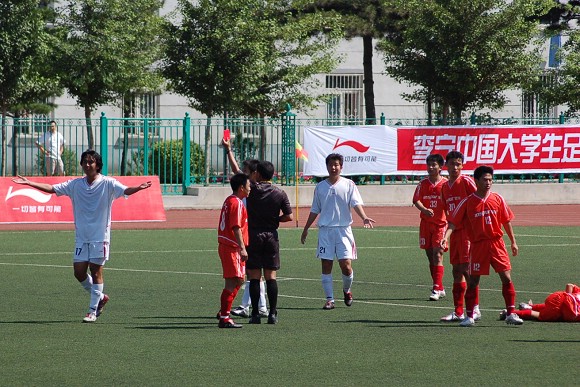 6月28日,李寧杯第六屆中國大學生足球聯賽決賽階段的比賽在遼寧沈陽正式開戰,我校足球隊(著紅色隊服)在小組賽中首戰面對青島大學足球隊。由于我校足球隊曾連續獲得三屆聯賽冠軍,今年又首次參加全國職業足球乙級聯賽且戰績輝煌,使得各隊都非常重視與我隊的比賽。
