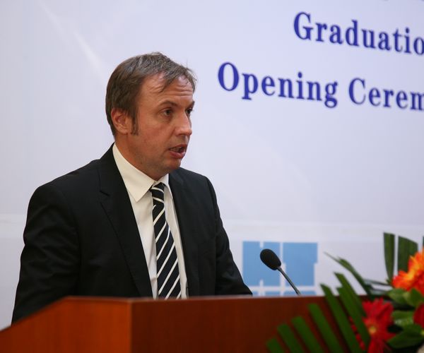 戴姆勒大中華區首席財務官Helmut Ruhl先生對畢業生表示祝賀。他說:這是自己第三次參加EMBA項目的畢業典禮。作為國際企業,戴姆勒公司將多種文化融會成為戴姆勒文化。并將與參加項目的所有員工一道創造企業更好的未來。