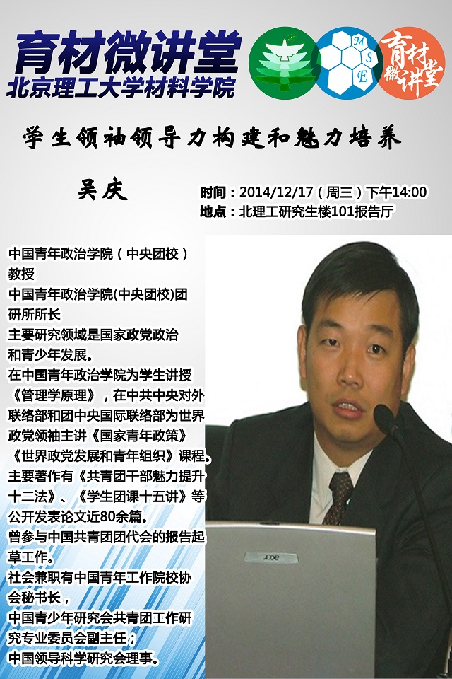 “育材微講堂”第十三期預(yù)告—中央團校吳慶教授講述學(xué)生領(lǐng)袖領(lǐng)導(dǎo)力構(gòu)建和魅力培養(yǎng)
