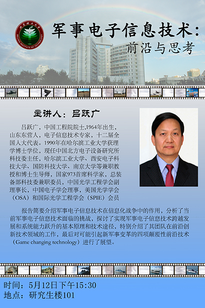 呂躍廣,中國工程院院士,1964年出生,山東東營人,電子信息技術專家,十二屆全國人大代表。1990年在哈爾濱工業大學獲理學博士學位,現任中國北方電子設備研究所科技委主任,哈爾濱工業大學、西安電子科技大學、國防科技大學、南京大學等兼職教授和博士生導師,國家973首席科學家,總裝備部科技委兼職委員,中國光學工程學會副理事長,中國電子學會理事,美國光學學會(OSA)和國際光學工程學會(SPIE)會員。長期從事空間電子信息系統設計、光電信息處理等方面的研究工作;近年來作為主要完成人獲國家科技進步一等獎一項、國家技術發明和科技進步二等獎四項,享受政府特殊津貼,2008年獲中國科協“求是”杰出青年實用工程獎,2010年被評為全國優秀科技工作者,發表論文60余篇,出版專著三部。
