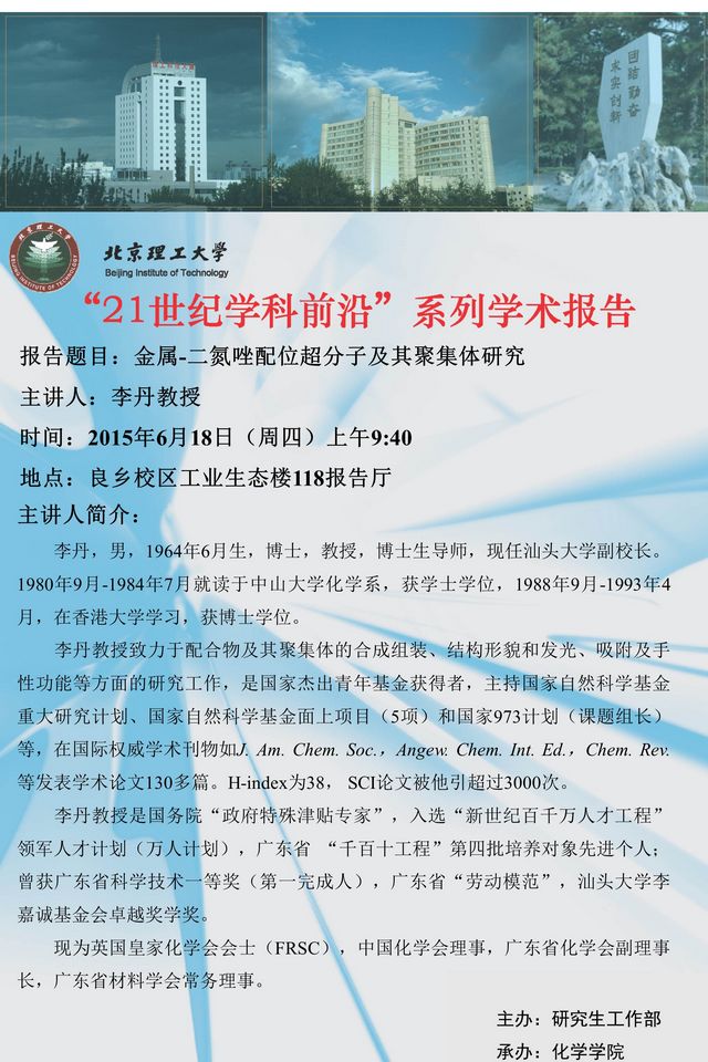 化學學院"21世紀學科前沿"系列學術報告預告