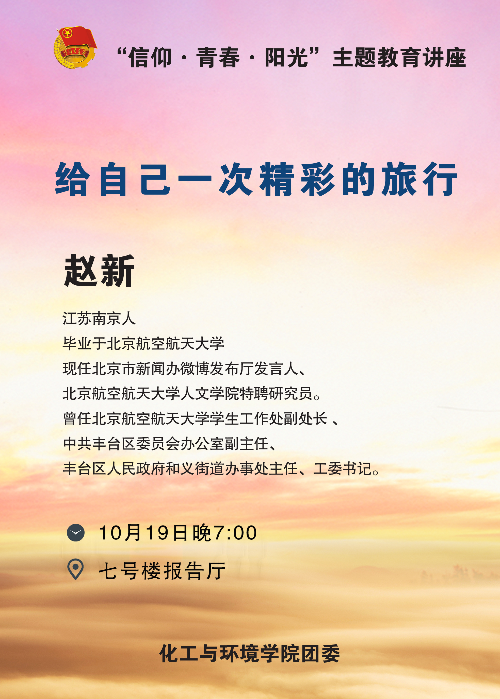 為進(jìn)一步做好高校共青團(tuán)思想引領(lǐng)工作,引導(dǎo)廣大團(tuán)員青年“堅(jiān)定崇高信仰、錘煉火熱青春、保持陽光心態(tài)”,化工與環(huán)境學(xué)院團(tuán)委有幸邀請(qǐng)到豐臺(tái)區(qū)人民政府和義街道辦公室主任、工委書記趙新老師為同學(xué)們做一場精彩的主題教育講座,歡迎廣大老師、青年同學(xué)聆聽。