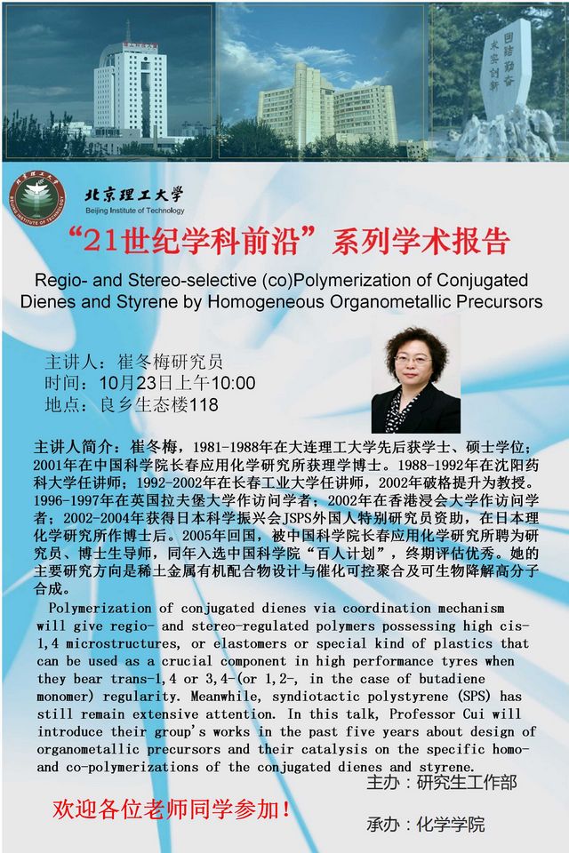 【化學學院】“21世紀學科前沿”崔冬梅研究員學術報告通知