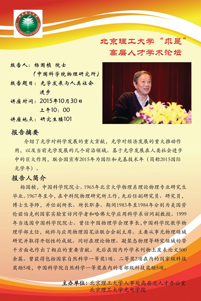 今年是聯(lián)合國所命名的“國際光學年”。北京理工大學人事處、光電學院有幸邀請到了中國科學院的楊國楨院士為廣大師生做一場光學發(fā)展和對人類社會所產(chǎn)生的巨大推動作用的報告。楊國楨院士任職于中科院物理研究所,長期從事光物理方面的研究,并取得了很多開創(chuàng)性的成就。歡迎大家參加。