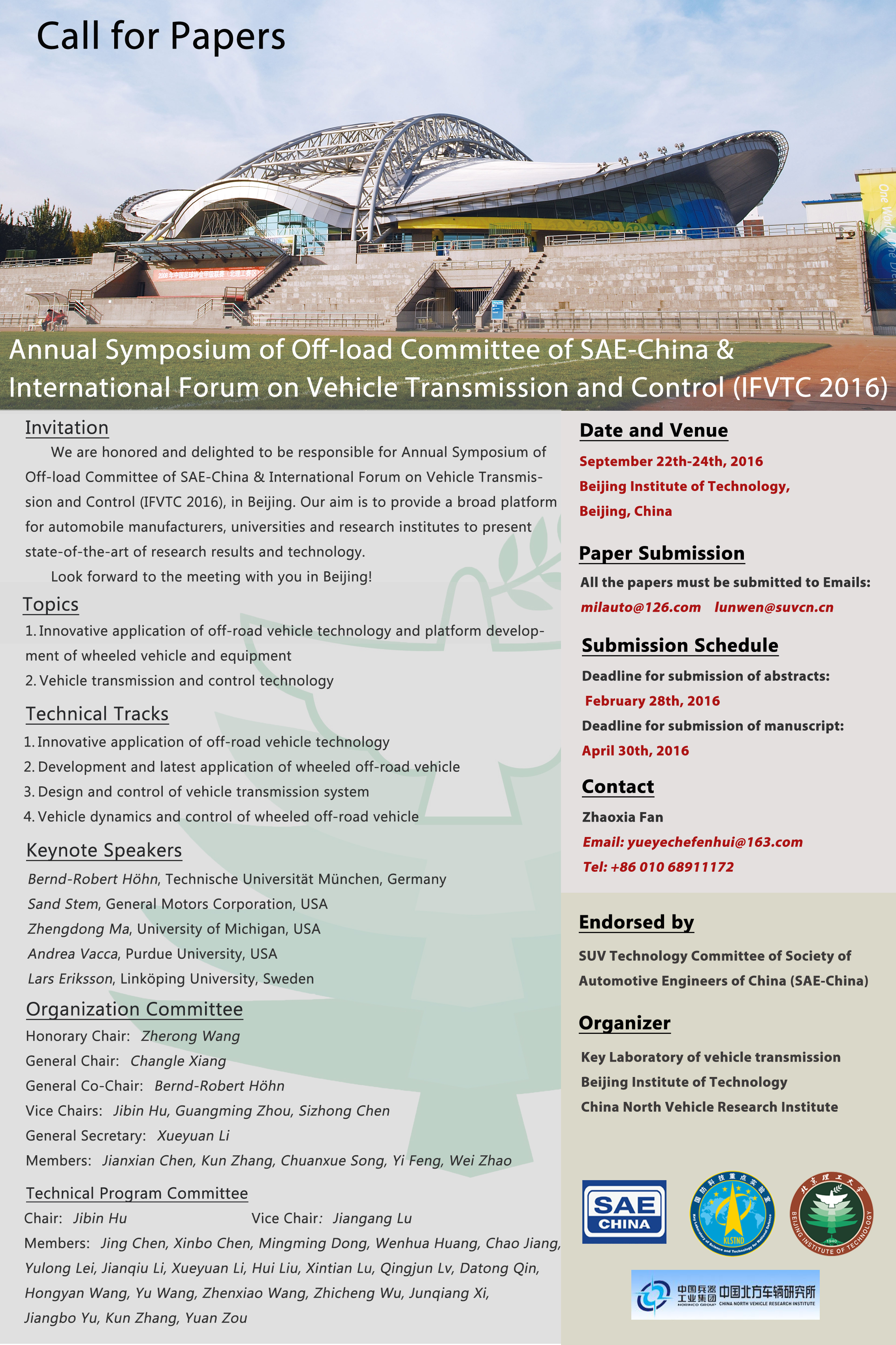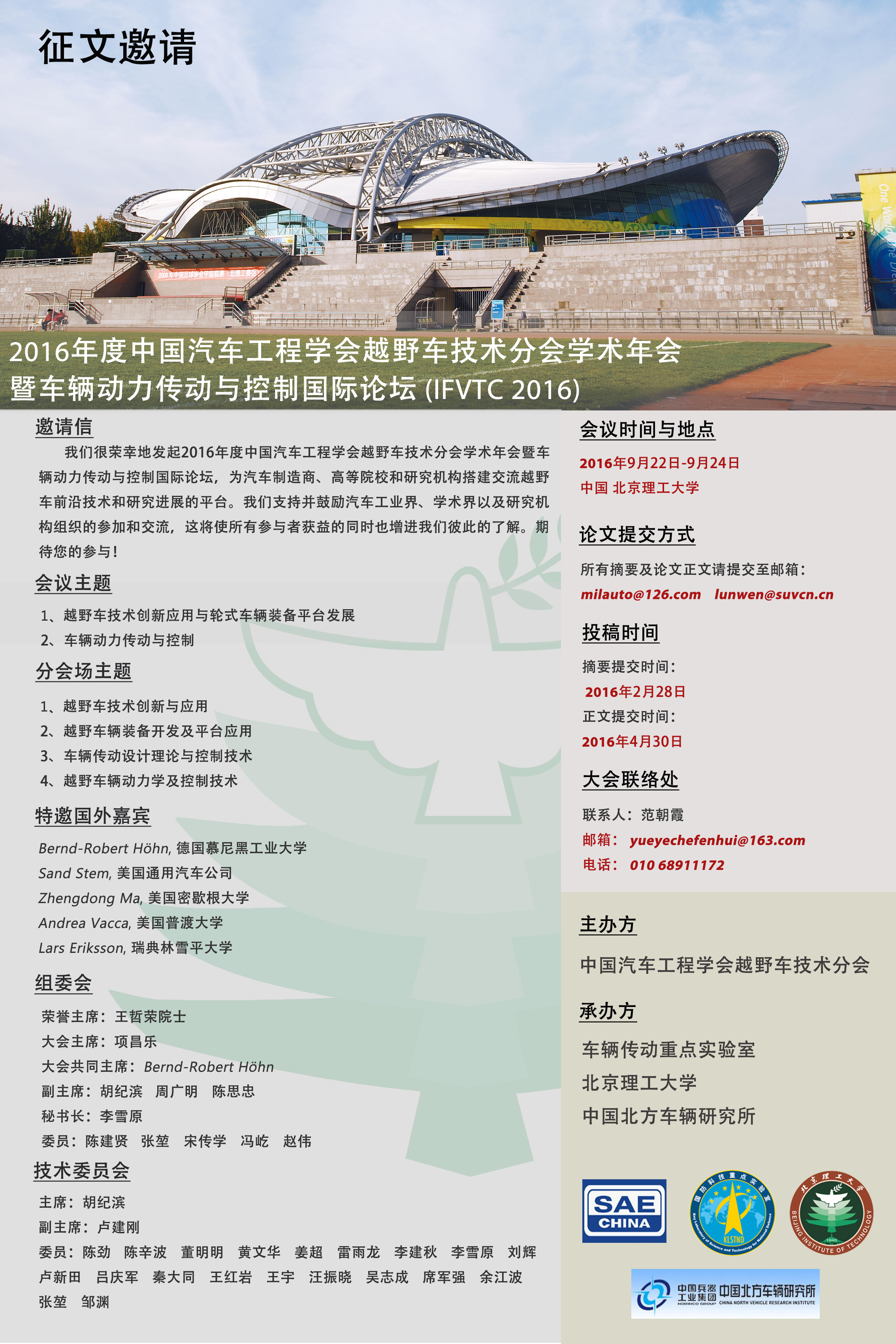 【機械學院 】2016中國汽車工程學會越野車技術分會年會暨車輛動力傳動與控制國際論壇 (IFVTC 2016)征文通知
