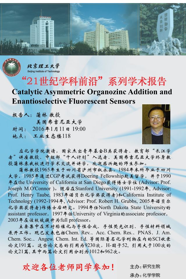 【化學學院】“21世紀學科前沿”蒲林教授學術報告通知