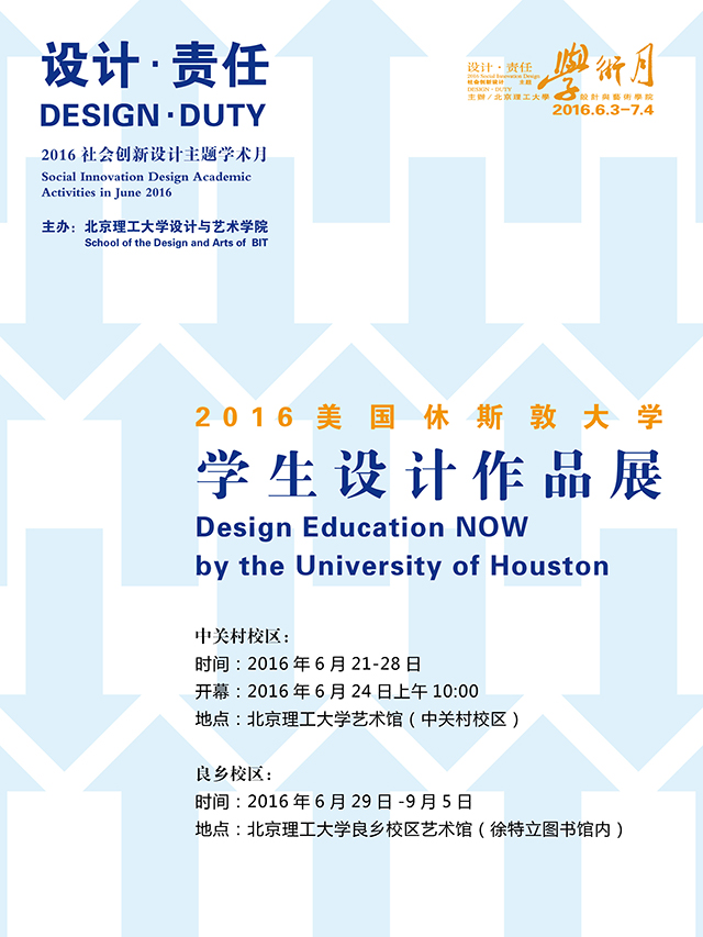 2016“設計·責任”主題學術月系列展覽之一,美國休斯敦大學學生設計作品展將于6月21-28日在北京理工大學藝術館(中關村校區)展出,展覽開幕式將于24日上午10:00進行。 此次作品展以休斯敦建筑學院工業設計系本科生的產品設計作品為主,總計40余幅。中關村校區展覽結束后將移至良鄉校區藝術館(徐特立圖書館內)繼續展出,時間為6月29日-9月5日。歡迎設計界專家、同仁、同學們蒞臨現場觀摩、指導。
