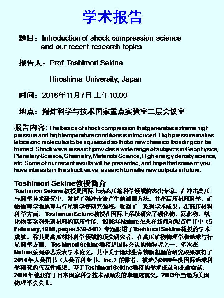 廣島大學Toshimori Sekine教授學術報告預告預告