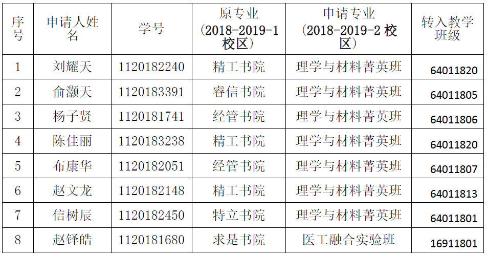 根據《北京理工大學本科生學籍管理細則》(北理工辦發〔2017〕74號)、《北京理工大學本科生管理規定》和《北京理工大學本科生專業分流、轉專業實施細則》中的要求,求是書院嚴格按照實施細則對提交轉專業申請的同學,進行資料審核,并于2019年1月15日在良鄉至善園A-106室進行面試,求是書院接收8名轉專業學生,現將結果公示: