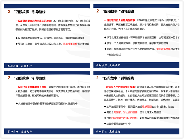 一段反思回望自己大學(xué)得失的故事、一段北理歷史人物的典型故事、一段自己未來兩年的成長故事、一段未來人生的家國情懷故事。