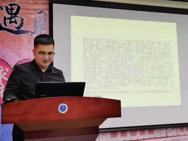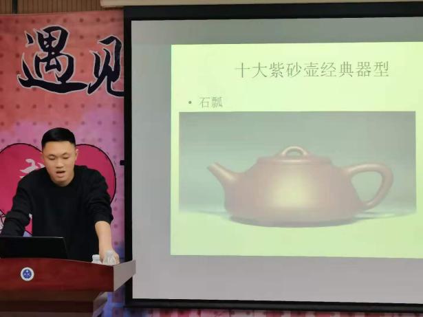 吳宇翔先生生動的為我們介紹了十大紫砂壺經典器型,紫砂壺那美輪美奐的造型加上吳宇翔先生的講述,到場的求是書生都聽的如癡如醉。潘登先生以紫砂壺起源歷史開始,為我們開啟了一段與紫砂壺為伴的奇妙之旅,每個人都被紫砂壺精美的外表和濃厚的歷史底蘊所深深吸引。在欣賞紫砂壺的同時,兩位老師還為我們補充了紫砂壺的制作材料、工藝等一系列知識,在學習紫砂壺深厚文化的同時還與我們的專業知識產生聯系。兩位紫砂壺大師的講述引發了同學們強烈的共鳴,同學們在講座結束后還提出來一些有關紫砂壺以及紫砂泥的問題,展現出對紫砂壺的濃厚興趣,這也離不開兩位先生的傾情講述。