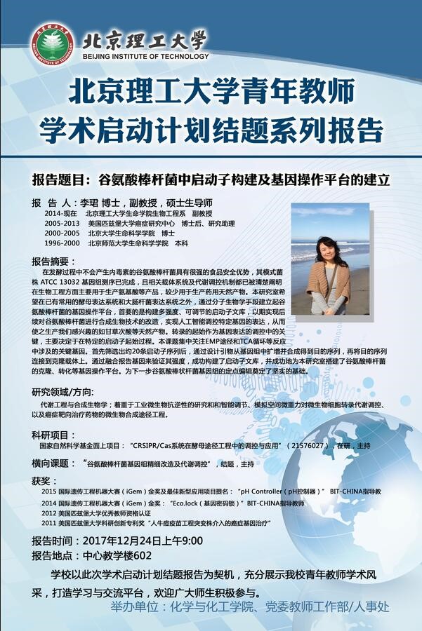 化學與化工學院  李珺  谷氨酸棒桿菌中啟動子構建及基因操作平臺的建立