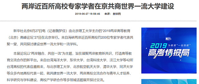 由北京理工大學主辦的“2019兩岸高等教育(北京)高峰論壇”27日在北京舉行。來自海峽兩岸近百所高校約200位專家學者代表共聚一堂,共同探討建設世界一流大學和一流學科。