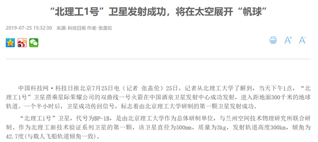 編輯:吳楠 審核:王征 閱讀次數:原文標題:“北理工1號”衛星發射成功,將在太空展開“帆球”
