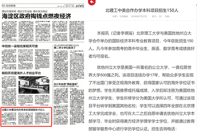 北京理工大學與美國猶他州立大學合作舉辦的國際經(jīng)濟本科專業(yè)教育項目,今年獲批招生150人。凡今年參加高考的高中畢業(yè)生,英語、數(shù)學高考成績良好者均可報名。
