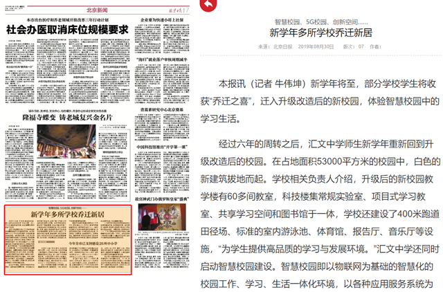 經過六年的周轉之后,匯文中學師生新學年重新回到升級改造后的校園。在占地面積53000平方米的校園中,白色的新建筑拔地而起。學校相關負責人介紹,升級后的新校園教學樓有60多間教室,科技樓集常規實驗室、項目式學習教室、共享學習空間和圖書館于一體,學校還建設了400米跑道田徑場、標準的室內游泳池、體育館、報告廳、音樂廳等設施,“為學生提供高品質的學習與發展環境?!眳R文中學還同時啟動智慧校園建設。智慧校園即以物聯網為基礎的智慧化的校園工作、學習、生活一體化環境,以各種應用服務系統為載體,將教學、科研、管理和校園生活進行充分融合。未來,在新技術的支撐下,該校將推進人工智能培養、集成辦公、評價管理、大數據分析、家校協同教育等多個項目的建設實施。