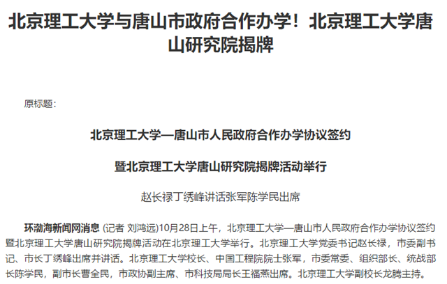 北京理工大學與唐山市政府合作辦學!北京理工大學唐山研究院揭牌