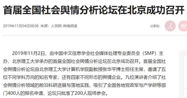 2019年11月2日,由中國中文信息學會社會媒體處理專業委員會(SMP)主辦、北京理工大學承辦的首屆全國社會輿情分析論壇在北京成功召開。首屆全國社會輿情分析論壇由北京理工大學計算機學院副教授張華平博士擔任主席,邀請了五位不同學科方向的知名專家,還有四家不同形態的輿情企業。九位演講者介紹了社會輿情分析領域的前沿科研進展與落地實踐,吸引了全國各地黨政軍與產學研等部門400人的報名申請,論壇只批準了200人現場參會。