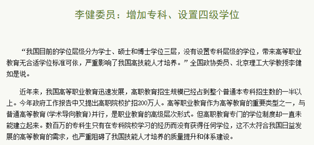 原文標(biāo)題:李健委員:增加專(zhuān)科、設(shè)置四級(jí)學(xué)位