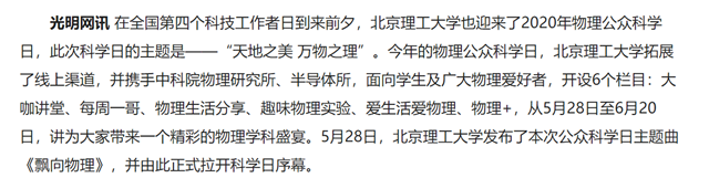 在全國第四個科技工作者日到來前夕,北京理工大學也迎來了2020年物理公眾科學日,此次科學日的主題是——“天地之美 萬物之理”。今年的物理公眾科學日,北京理工大學拓展了線上渠道,并攜手中科院物理研究所、半導體所,面向學生及廣大物理愛好者,開設6個欄目:大咖講堂、每周一哥、物理生活分享、趣味物理實驗、愛生活愛物理、物理+,從5月28日至6月20日,為大家帶來一個精彩的物理學科盛宴。5月28日,北京理工大學發布了本次公眾科學日主題曲《飄向物理》,并由此正式拉開科學日序幕。