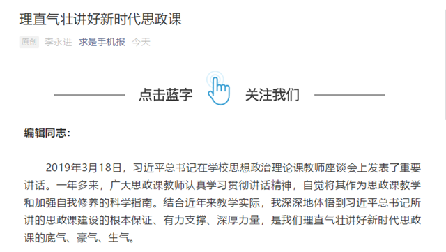 2019年3月18日,習近平總書記在學校思想政治理論課教師座談會上發表了重要講話。一年多來,廣大思政課教師認真學習貫徹講話精神,自覺將其作為思政課教學和加強自我修養的科學指南。結合近年來教學實際,我深深地體悟到習近平總書記所講的思政課建設的根本保證、有力支撐、深厚力量,是我們理直氣壯講好新時代思政課的底氣、豪氣、生氣。