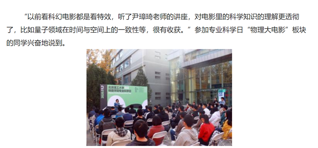 “以前看科幻電影都是看特效,聽了尹璋琦老師的講座,對電影里的科學知識的理解更透徹了,比如量子領域在時間與空間上的一致性等,很有收獲。”參加專業科學日“物理大電影”板塊的同學興奮地說到。