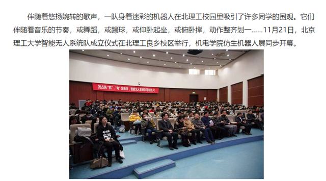 伴隨著悠揚婉轉的歌聲,一隊身著迷彩的機器人在北理工校園里吸引了許多同學的圍觀。它們伴隨著音樂的節奏,或舞蹈,或踢球,或仰臥起坐,或俯臥撐,動作整齊劃一……11月21日,北京理工大學智能無人系統隊成立儀式在北理工良鄉校區舉行,機電學院仿生機器人展同步開幕。