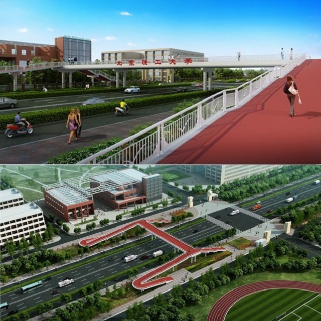 良鄉東路(西區)人行過街天橋橫跨良鄉東路,天橋主橋中心線位于學校校門西側約75米,2號食堂南側,跨徑為60米,梯道與坡道與地面銜接后,新做步道通過校園圍欄開口順接入校園內。總投資1900萬元。此次建設的天橋將是良鄉校區的第一座天橋,保障師生交通安全,坡道設置方便出行,減少交通事故的發生,并提高良鄉東路的車輛通行能力。過街天橋還將深化設計,建成封閉式天橋,提高師生出行的舒適度,邀請宣傳部、設計藝術學院運用文化元素對天橋進行人文設計,建設“文化走廊”。