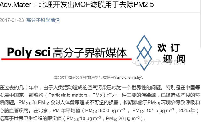 【高分子科學前沿微信公眾平臺】Adv.Mater:北理開發出MOF濾膜用于去除PM2.5