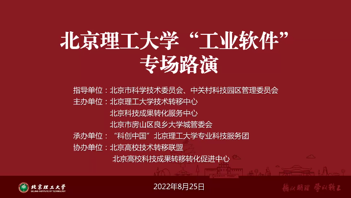 8月25日下午,北京理工大學“工業軟件”專場路演活動舉行。本次活動在北京市科委、中關村管委會的支持和指導下,由北理工技術轉移中心、北京科技成果轉化服務中心和北京市房山區良鄉大學城管委會聯合主辦。路演采取線上線下相結合的方式,受到社會各界廣泛關注。