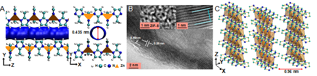圖2. MOF-NS層間分子傳遞通道: (A)Zn2(MeIm)4的層間通道和孔徑大小;(B)MOF-NS HR-TEM圖像;(C)MOF-NS的層狀結(jié)構(gòu)和層間通道。