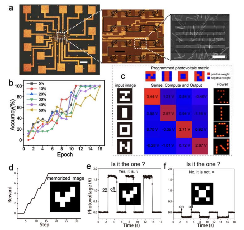 基于這種新型的鐵電效應,研究人員對WS2納米管施加外部電壓/電流激勵,配合WS2納米管恰當的禁帶寬度,在可見光法位內產生光伏響應的鐵電回滯(如圖1所示)。WS2納米管的介觀滑移鐵電效應使其光伏響應具備可編程且不揮發的光伏特性,因此是一種天然、理想的光伏隨機存取存儲器(photovoltaic random-access memory, PV-RAM)。研究團隊進一步利用該特性制備了16像素的PV-RAM陣列,并利用陣列中每個PV-RAM結構單元的光響應度(即輸出光電流與輸入光功率的比值)作為神經網絡中的突觸權重,通過外部電壓/電流激勵調節權重,實現了神經網絡算法在硬件層面的嵌入,并成功演示了基于監督學習和強化學習兩種算法的圖像識別功能(如圖2所示)。這是首次將傳感、計算、存儲、驅動四種功能集成到基于智能材料的硬件系統中,對于構建未來高速、低功耗甚至自驅動的智能化物聯網平臺有著重要的參考意義。