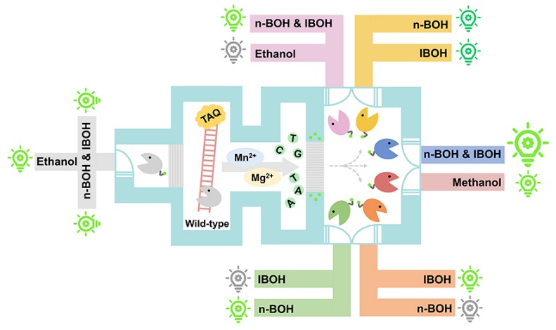 高級醇如正丁醇、異丁醇或異戊醇均具有高能量密度和低吸濕性,同時腐蝕性較小且不易揮發,是一類極具潛力的可替代化石燃料的生物能源。近年來,在連續取樣檢測的條件下,已有大量工作通過標記和篩選體系來動態監測高級醇的產量,但這些方法依舊無法實現實時監測,且易污染樣品;與之相比,生物傳感系統具有更高的安全性、穩定性及普適性,更適于工業生產過程中的連續監測。