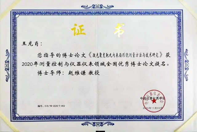 12月24日,中國儀器儀表學會2020年科技獎勵大會暨九屆三次理事(擴大)會議在浙江省杭州市召開,本次大會上頒發了2020年全國儀器科學與技術學科優秀博士論文獎及提名獎。今年共評選出優秀博士論文5篇,優秀博士論文提名5篇。北京理工大學光電學院博士畢業生程陽獲優秀博士論文獎,王龍肖獲優秀博士論文提名獎。