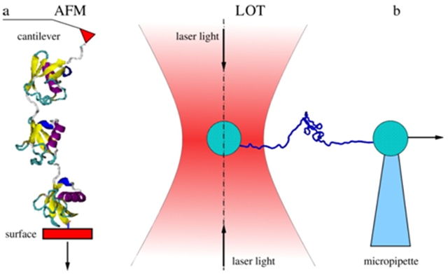 圖1. 力譜方法測(cè)量單分子鍵性質(zhì)示意圖。(a)原子力顯微鏡;(b)光鑷。(該圖摘自于Sanjay Kumara and Mai Suan Li, Physics Reports 486 (2010) 1-74)。