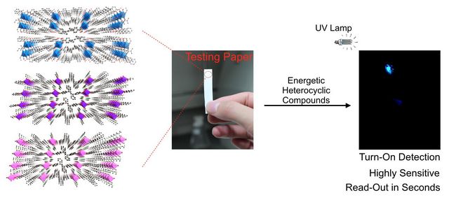 化學(xué)學(xué)院的王博、馮霄等研究者在前期的工作基礎(chǔ)上(Chem. Commun., 2013, 49, 7049;Chem. Eur. J., 2014, 20, 8856;Chem. Sci., 2014, 5, 4388),開發(fā)出一種高靈敏、裸眼可視、簡便的五元雜化爆炸物的熒光檢測方法,并且裸眼檢出限可達6.5 ng/cm2,爆炸物溶液光譜檢出限可達10-9 mol/L。該方法利用本身具有聚集誘導(dǎo)發(fā)光性質(zhì)的有機連接基元與金屬離子進行連接,制備金屬有機骨架材料(MOF)作為傳感器,并通過改變金屬離子的種類調(diào)節(jié)MOF傳感器的熒光特性。當(dāng)引入特定金屬離子時,MOF傳感器的熒光可以被預(yù)先“關(guān)掉”,而當(dāng)該傳感器接觸到五元雜環(huán)爆炸物時,熒光“開關(guān)”可被迅速觸發(fā),使得熒光在十幾秒內(nèi)重新被釋放出來。這一由“關(guān)”到“開”的熒光信號變化,不僅可以被光譜儀器所捕捉從而用于定量檢測,還可十分容易的通過裸眼直接觀察到。該傳感器可直接用于便攜式試紙檢測。該研究成果近日發(fā)表在國際頂級化學(xué)期刊《Journal of the American Chemical Society》上(J. Am. Chem. Soc., 2014, DOI:10.1021/ja508962m)。北京理工大學(xué)材料學(xué)院的董宇平教授對該研究工作提出了寶貴的建議。
