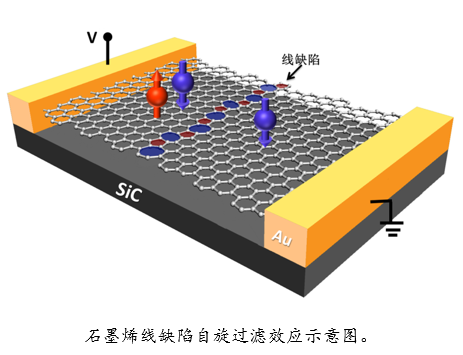 吳漢春課題組與臺灣大學張慶瑞教授課題組就這一問題展開合作,他們通過理論和實驗相結合研究了納米缺陷對石墨烯自旋輸運的影響,發(fā)現(xiàn)5-7-5-7線缺陷的局域態(tài)在無外加磁場下能產(chǎn)生室溫自旋過濾效應,在施加面內(nèi)磁場下能導致一個5%的正磁阻,從而提供了一種在石墨烯體系中引入自旋自由度的新途徑(如下圖所示)。