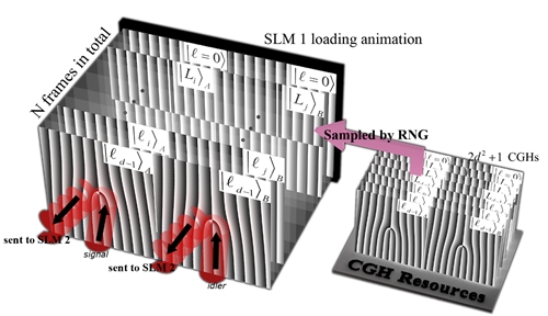 光的軌道角動量自由度由于其天然的高維屬性,自發現起就被廣泛應用于各類高維系統的構建中。在實驗中通過光的參量下轉換過程產生了軌道角動量光的最大糾纏態