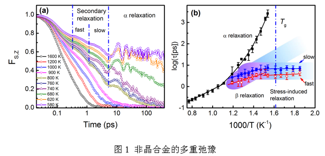 非晶態物質是一種微觀結構長程無序、能量長期處于亞穩態的復雜多體相互作用體系。非晶態合金(又稱金屬玻璃)是50多年前發現的一類新型的非晶材料,它的發現極大豐富了金屬物理的研究內容,日益成為凝聚態物理的研究前沿。非晶合金表現出很多獨特的物理、化學性質,特別是塊體非晶合金具有優異的力學性能,例如超高的強度和斷裂韌性、高強度、低彈性模量等。塊體非晶合金被認為是迄今為止發現的最強、最硬、最軟、最韌的金屬結構材料。盡管近年來在非晶合金方面涌現出大批的研究成果,但非晶合金中的一些基本問題仍然缺乏清晰的認識,例如非晶態轉變的物理本質和非晶合金優異力學性能的物理本源等。目前的研究表明這些問題都與非晶合金中復雜的多重弛豫行為有關聯。在非晶態合金形成過程中,存在長時結構弛豫與短時次級弛豫(?弛豫)并存的多重動力學行為,次級弛豫的行為表征以及微觀機制是目前非晶合金研究中的關鍵問題。