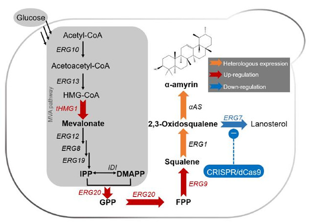 在將MdOSC1引入釀酒酵母前,研究人員對釀酒酵母進行了代謝工程改造。α-香樹脂醇的合成前體(3S)-2,3-氧化鯊烯來自甲羥戊酸(MVA)途徑,通過過表達MVA途徑中的四個關鍵酶(角鯊烯單加氧酶ERG1,HMG合酶tHMG1,FPP合酶ERG20和鯊烯合酶ERG9)以增加(3S)-2,3-氧化鯊烯的供應提高萜類化合物的產量。然而,釀酒酵母內源的羊毛甾醇合酶ERG7能夠利用(3S)-2,3-氧化鯊烯作為底物催化生成羊毛甾醇和麥角固醇,是合成香樹脂醇的主要競爭途徑,為了進一步提高α-香樹脂醇產量,研究人員使用CRISPR/dCas9系統對ERG7的表達進行抑制,使流向羊毛甾醇的(3S)-2,3-氧化鯊烯代謝流降低,更多的流向α-香樹脂醇的合成途徑。