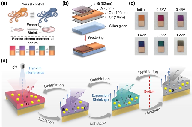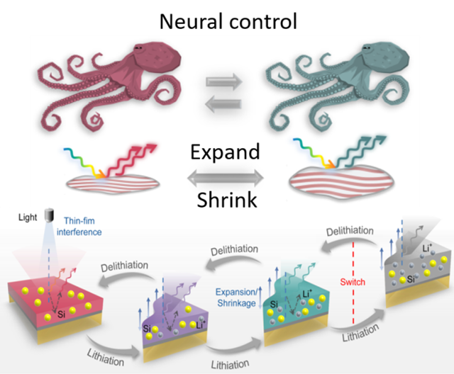 大自然中有多種能夠自適應變色偽裝的生物,以章魚為例,當外界環境發生改變時,章魚能夠通過主動調控皮膚細胞中蛋白質的體積來改變光在不同界面的相位差,從而實現皮膚變色。方岱寧課題組通過設計具有穩定可逆膨脹的硅膜電極,模仿章魚皮膚變色機理,巧妙地利用嵌鋰電位(<1 V),精確控制鋰離子在硅薄膜中的脫嵌行為,實現硅膜的高精度體積變化調控,改變硅膜結構對光線反射產生干涉消光條件,獲得一系列絢麗色彩。值得一提的是,調控硅薄膜中的嵌鋰程度,可以實現關閉或開啟光線干擾作用,器件可以實現彩色至銀色的切換功能。
