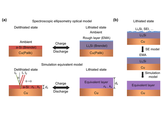 該團隊通過實驗和理論模擬進一步研究了該仿生變色器件中的電化學力學耦合變色機理。采用橢偏儀測試了其不同鋰化程度下的納米硅薄膜的光學常數(折射率和消光系數),以及相對應的納米硅薄膜的厚度,驗證了鋰化納米硅薄膜的化學演化過程。通過建立光學理論模型,預測出不同嵌鋰程度下的器件反射率,其預測結果和實驗測試吻合,進一步驗證了該仿生變色器件的調控機理。