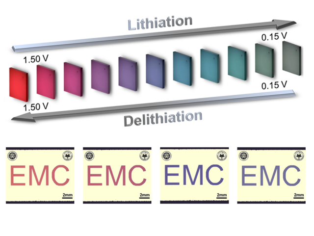 該仿生結構變色器件具有很強的設計應用前景,改變硅薄膜的初始厚度和導電集流體顏色,可以任意定制所需要的顏色調控范圍。通過光刻技術,可以定制各種顯色圖案。并且,該變色系統和硅基鋰離子電池具有良好的兼容性,在硅基鋰離子電池的可視化實時監控中也有巨大的應用前景。
