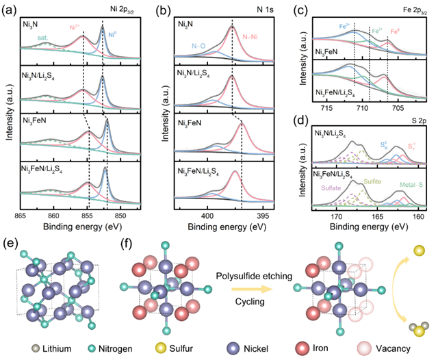 類似于金屬催化劑設計的合金化策略,該團隊在單金屬化合物中引入外在金屬,活化了原來的惰性相化合物,從而促進多硫化物的表面反應動力學。以六方氮化鎳(Ni3N)作為概念驗證,其對多硫化物的催化活性較差。在引入鐵元素后,Ni3N轉變為高活性的立方鎳鐵氮化物(Ni3FeN)。在Ni3FeN中,處于立方結構頂角處的較高正電性的鐵(與鎳相比)傾向于通過多硫化物的刻蝕過程浸出,從而在鎳位點的周圍留下大量空位缺陷,極大地提高了Ni3N的催化活性。
