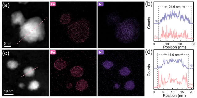 圖2.(a,b)循環前和(c,d)循環后Ni3FeN-G的HAADF-STEM圖像和相應的元素分布