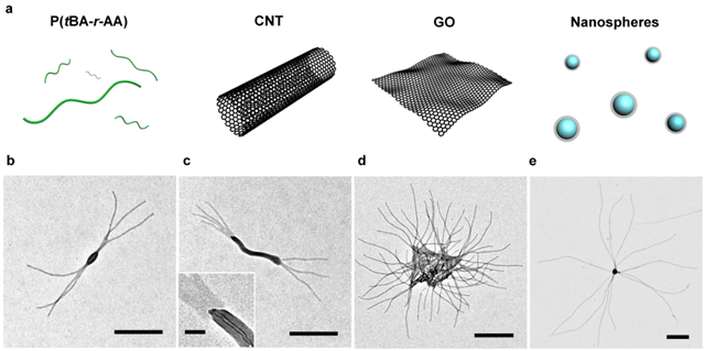 作者進而探索了這些超分子聚合物在加熱條件下的解離和降溫后重新組裝的過程,證明其聚合度完全由組裝條件所決定,并可通過調節實驗參數使得超分子聚合物在不同長度之間互相轉換。此外,作者還研究了多種其他小分子引發劑,它們可分別與聚合物形成氫鍵,鹵鍵,季銨化物和金屬配位鍵等多種超分子作用。通過簡單的加熱-降溫過程,所有引發劑都可以通過一鍋法制備出長度均一的柱狀膠束,且引發劑的種類可以顯著影響膠束長度。更有趣的是,作者發現不僅可以使用小分子作為引發劑,在使用大分子或納米顆粒作為引發劑時,可以制備出尺寸可控的分支形、嵌段形、毛刷狀或星形多級納米結構(具有多種拓撲結構的超分子聚合物)。