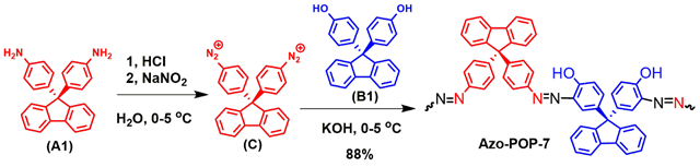 然而,目前報道的大部分有機多孔聚合物不熔融不溶解,一定程度上限制了其進一步應(yīng)用。因此,從分子鏈的扭曲構(gòu)象出發(fā),以“逆合成”的思路選擇合適的聚合物單體和高效的聚合反應(yīng),制備新型的可溶性有機多孔聚合物材料,對推進有機多孔聚合物材料領(lǐng)域的研究具有重要意義,也成為一個研究熱點。最近,黃木華課題組利用重氮偶聯(lián)反應(yīng),從具有扭曲構(gòu)象的9,9-二(4-羥基苯基)芴和9,9-二(4-胺基苯基)芴單體出發(fā),實現(xiàn)了偶氮鍵鏈接的可溶性有機多孔聚合物材料Azo-POP-7的快速制備(圖1)。